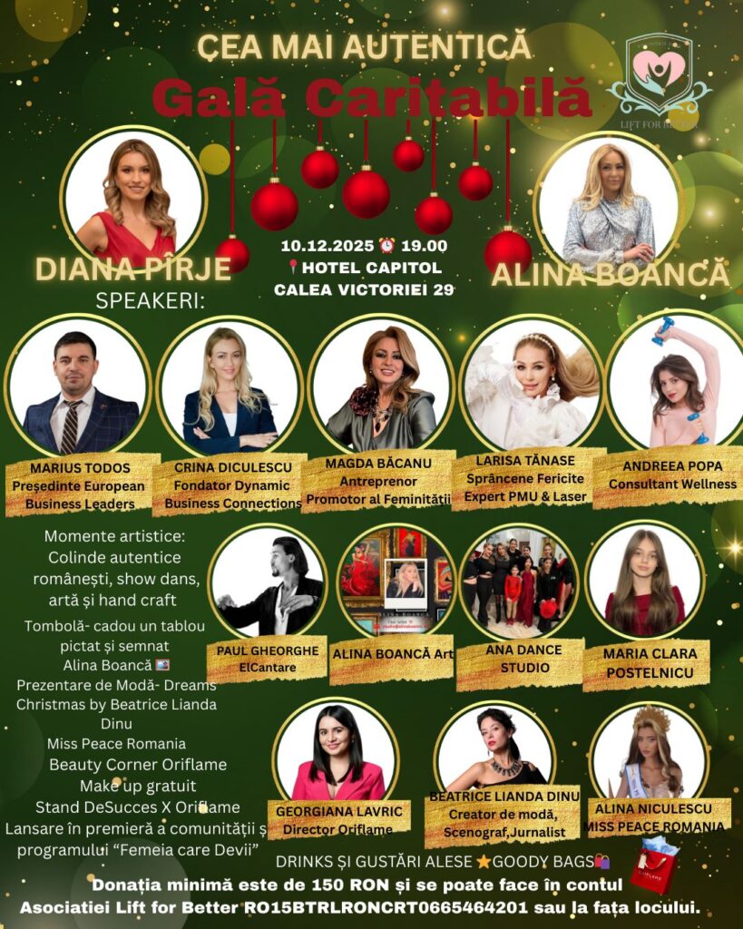 Seara este organizată de Asociația Lift for Better, condusă din 2022 de Alina Boancă, un lider discret dar puternic, care și-a dedicat ultimii ani proiectelor sociale și acțiunilor umanitare cu impact real.