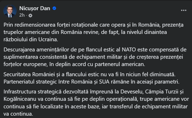 Statele Unite au decis reducerea rotațiilor unei brigăzi care opera pe flancul estic, inclusiv în România, readucând efectivele la nivelul anterior războiului din Ucraina. Aceasta nu echivalează cu o retragere completă: aproximativ 1.000 de militari americani vor rămâne staționați permanent, iar infrastructurile strategice din Deveselu, Câmpia Turzii și Kogălniceanu continuă să fie operaționale.